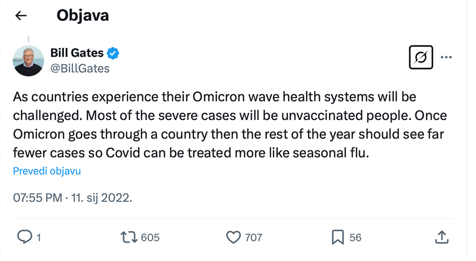 Dakle, Bill Gates nije post festum tvrdio da je koronavirus opasan na razini gripe, kako to tvrdi Miletić. Umjesto toga, usred pandemije iznio je predviđanje o mogućem razvoju situacije nakon što omikron val prođe i stekne se prirodni imunitet. Miletić ovom interpretacijom Gatesovih riječi namjerno iskrivljuje njihovo značenje.