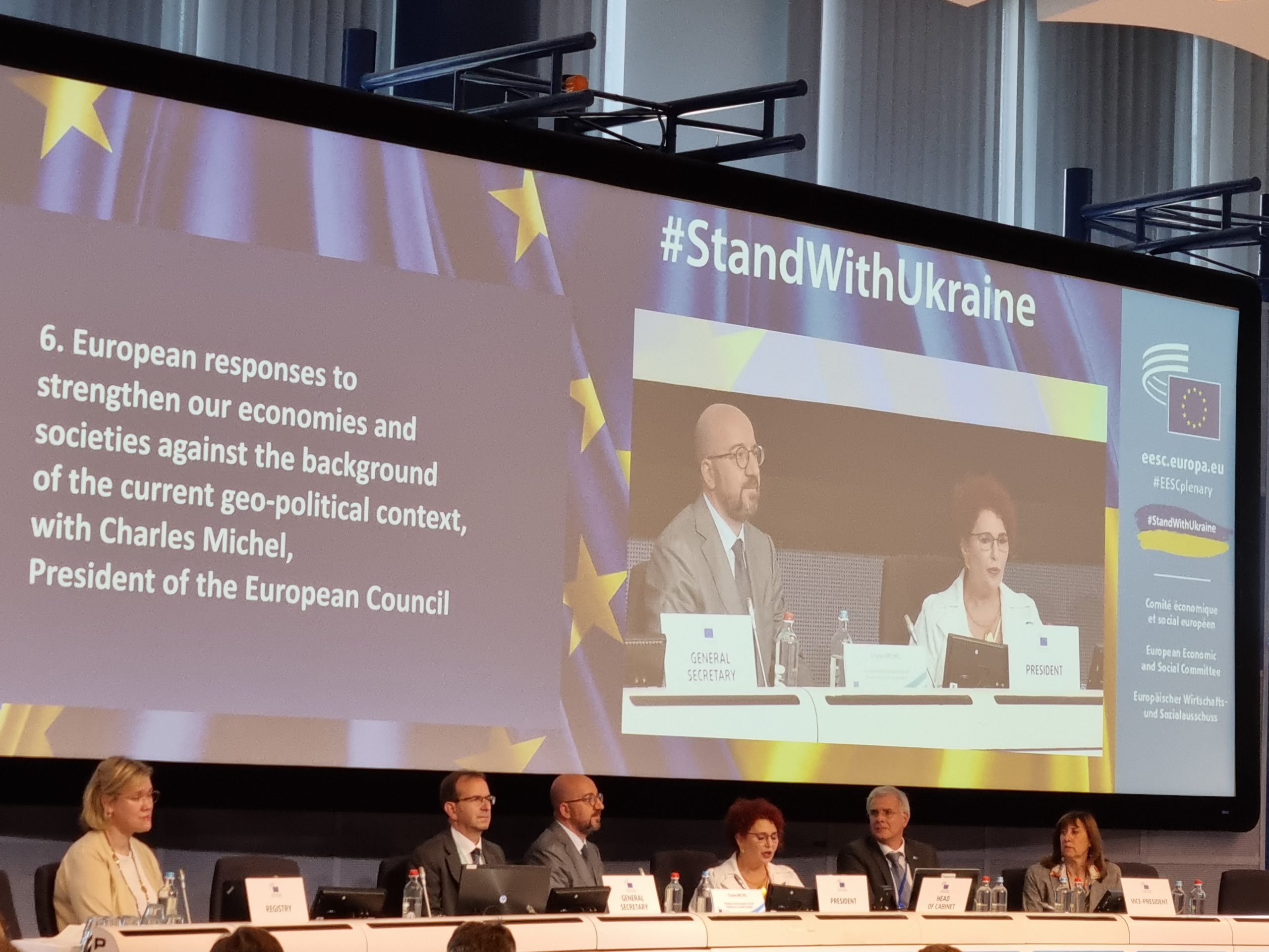 Na svibanjskoj plenarnoj sjednici Europskog gospodarskog i socijalnog odbora (EGSO) održana je rasprava koju su vodili predsjednica EGSO-a Christa Schweng i predsjednik Europskog vijeća Charles Michel o odgovoru Europe na trenutnu prekretnicu u povijesti. Charles Michel je prvi put predstavio ideju stvaranja europske geopolitičke zajednice, ali i novosti vezane za proširenje.